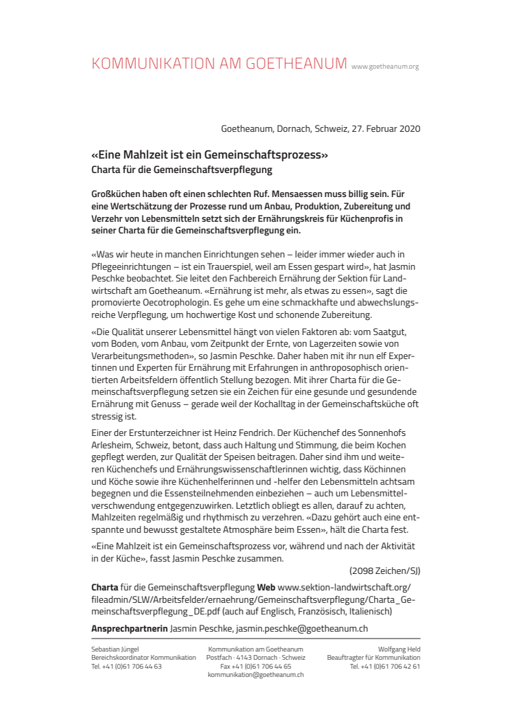 «Eine Mahlzeit ist ein Gemeinschaftsprozess». Charta für die Gemeinschaftsverpflegung