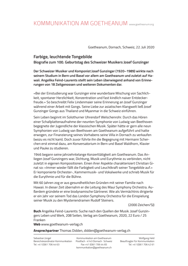 Der Schweizer Musiker und Komponist Josef Gunzinger (1920–1989) wirkte nach seinem Studium in Bern und Basel vor allem am Goetheanum und zuletzt auf Hawaii. Angelika Feind-Laurents stellt sein Leben überwiegend anhand von Erinnerungen von 18 Zeitgenossen und weiteren Dokumenten dar.