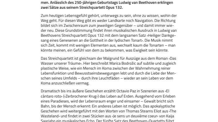 Zum heutigen Lebensgefühl gehört, unterwegs zu sein, ohne zu wissen, wohin der Weg geht. Für diesen Weg gibt es weder Landkarte noch Navigation. Die Richtung bildet sich im Zwischenraum zum jeweiligen Gegenüber – und damit immer wieder neu. Diese Grundstimmung findet ihren musikalischen Ausdruck in Ludwig van Beethovens Streichquartett Opus 132 mit dem langsamen Satz ‹Heiliger Dankgesang eines Genesenen an die Gottheit in der lydischen Tonart›. Die Musik nimmt sich Zeit, kommt mit wenigen Elementen aus, wechselt kaum die Tonarten – man könnte meinen, ein Gefühl von dem zu bekommen, was Ewigkeit sein könnte.