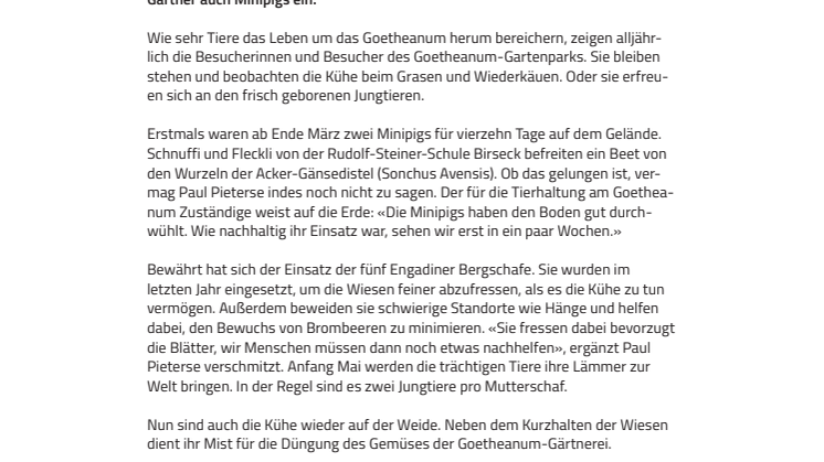 Wie sehr Tiere das Leben um das Goetheanum herum bereichern, zeigen alljährlich die Besucherinnen und Besucher des Goetheanum-Gartenparks. Sie bleiben stehen und beobachten die Kühe beim Grasen und Wiederkäuen. Oder sie erfreuen sich an den frisch geborenen Jungtieren.