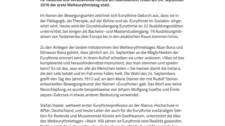 Auf Initiative der beiden Eurythmistinnen Aban Bana und Dilnawaz Bana aus Mumbai, Indien, und mit Unterstützung von Stefan Hasler, dem Leiter der Sektion für Redende und Musizierende Künste am Goetheanum, findet am 24. September 2016 der erste Welteurythmietag statt.