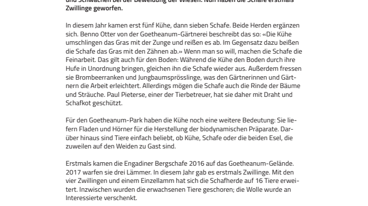 Erstmals kamen die Engadiner Bergschafe 2016 auf das Goetheanum-Gelände. 2017 warfen sie drei Lämmer. In diesem Jahr gab es erstmals Zwillinge. Mit den vier Zwillingen und einem Einzellamm hat sich die Schafherde auf 16 Tiere erweitert. Inzwischen wurden die erwachsenen Tiere geschoren; die Wolle wurde an Interessierte verschenkt.