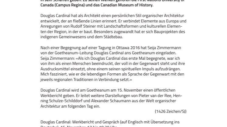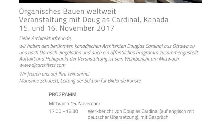 Am 15./16. November 2017 wird der kanadische Architekt Douglas Cardinal das Goetheanum besichtigen und in einer öffentlichen Veranstaltung einen Einblick in sein Schaffen geben. Zu seinen Werken gehören die First Nations University of Canada (Campus Regina) und das Canadian Museum of History.