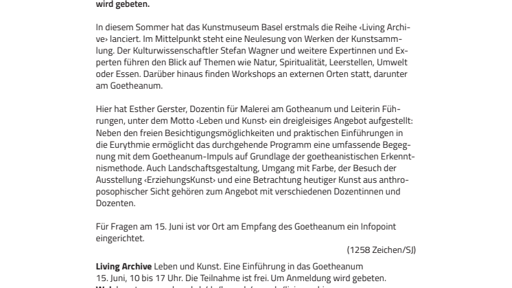 Living Archive Leben und Kunst. Eine Einführung in das Goetheanum, 15. Juni, 10 bis 17 Uhr. Die Teilnahme ist frei. Um Anmeldung wird gebeten.