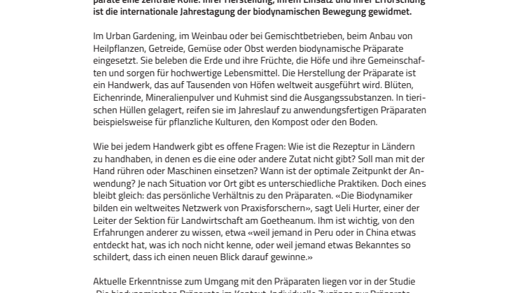 Die biodynamische Agrikultur zielt auf eine Verbesserung der Bodenfruchtbarkeit und regt an, den Hof als lebendigen Organismus zu führen. Dabei spielen die Präparate eine zentrale Rolle. Ihrer Herstellung, ihrem Einsatz und ihrer Erforschung ist die internationale Jahrestagung der biodynamischen Bewegung gewidmet.