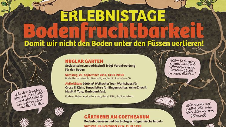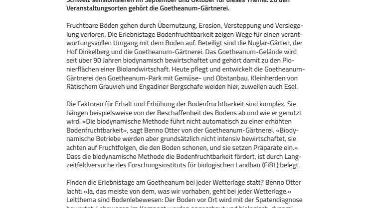 Zurzeit gibt es einen Rückgang fruchtbarer Böden. Die Erlebnistage Bodenfruchtbarkeit von BaselWandel und dem Bodenfruchtbarkeitsfonds der BioStiftung Schweiz sensibilisieren im September und Oktober für dieses Thema. Zu den Veranstaltungsorten gehört die Goetheanum-Gärtnerei.