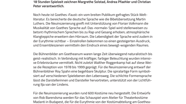 In rund 600 Rollen und Kostümen zeigen 18 Schauspielerinnen und Schauspieler sowie 23 Eurythmistinnen und Eurythmisten ‹Faust 1 und 2› am Goetheanum. Die Produktionskosten für die Neuinszenierung liegen bei rund sechs Millionen Franken. Das Goetheanum bringt diesen Betrag allein durch Eigenmittel, Spenden und Kartenverkauf auf – ohne Subventionen.