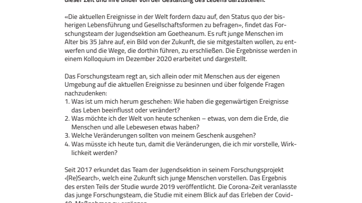 «Die aktuellen Ereignisse in der Welt fordern dazu auf, den Status quo der bisherigen Lebensführung und Gesellschaftsformen zu befragen», findet das Forschungsteam der Jugendsektion am Goetheanum. Es ruft junge Menschen im Alter bis 35 Jahre auf, ein Bild von der Zukunft, die sie mitgestalten wollen, zu entwerfen und die Wege, die dorthin führen, zu erschließen. Die Ergebnisse werden in einem Kolloquium im Dezember 2020 erarbeitet und dargestellt.