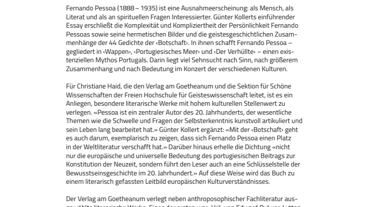 Für Christiane Haid, die den Verlag am Goetheanum und die Sektion für Schöne Wissenschaften der Freien Hochschule für Geisteswissenschaft leitet, ist es ein Anliegen, besondere literarische Werke mit hohem kulturellen Stellenwert zu verlegen. «Pessoa ist ein zentraler Autor des 20. Jahrhunderts, der wesentliche Themen wie die Schwelle und Fragen der Selbsterkenntnis kunstvoll artikuliert und sein Leben lang bearbeitet hat.» Günter Kollert ergänzt: «Mit der ‹Botschaft› geht es auch darum, exemplarisch zu zeigen, dass sich Fernando Pessoa einen Platz in der Weltliteratur verschafft hat.» Darüber hinaus erhelle die Dichtung «nicht nur die europäische und universelle Bedeutung des portugiesischen Beitrags zur Konstitution der Neuzeit, sondern führt den Leser auch an eine Schlüsselstelle der Bewusstseinsgeschichte im 20. Jahrhundert.» Auf diese Weise wird das Buch zu einem literarisch gefassten Leitbild europäischen Kulturverständnisses.
