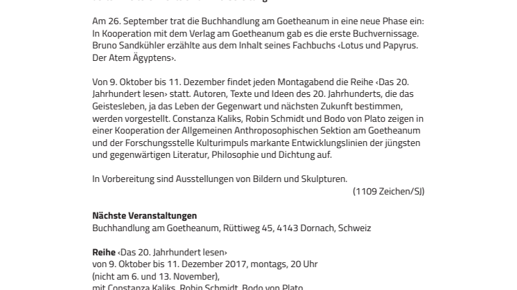 Die Buchhandlung am Goetheanum führt neu Veranstaltungen durch. Nach einer ersten Buchvernissage startet ab 9. Oktober jeden Montag die Reihe ‹Das 20. Jahrhundert lesen. Auseinandersetzung mit Texten und Autoren des 20. Jahrhunderts›. Weitere Events sind in Vorbereitung.