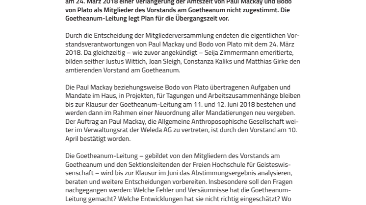 Die Generalversammlung der Allgemeinen Anthroposophischen Gesellschaft hat am 24. März 2018 einer Verlängerung der Amtszeit von Paul Mackay und Bodo von Plato als Mitglieder des Vorstands am Goetheanum nicht zugestimmt. Die Goetheanum-Leitung legt Plan für die Übergangszeit vor.