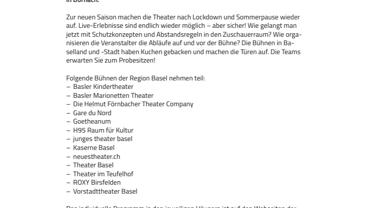 Zur neuen Saison machen die Theater nach Lockdown und Sommerpause wieder auf. Live-Erlebnisse sind endlich wieder möglich – aber sicher! Wie gelangt man jetzt mit Schutzkonzepten und Abstandsregeln in den Zuschauerraum? Wie organisieren die Veranstalter die Abläufe auf und vor der Bühne? Die Bühnen in Baselland und -Stadt haben Kuchen gebacken und machen die Türen auf. Die Teams erwarten Sie zum Probesitzen!