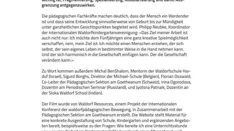 Die pädagogischen Fachkräfte machen deutlich, dass der Mensch ein Werdender ist und dass seine Entwicklung sinnvollerweise von Geburt bis zur Mündigkeit unter ganzheitlichen Gesichtspunkten begleitet wird. Philipp Reubke, Koordinator der Internationalen Waldorfkindergartenvereinigung: «Das Ziel meiner Arbeit ist auch nicht nur: Ich möchte dem Fünfjährigen eine ganz kreative Spielmöglichkeit verschaffen, nein, mein Ziel ist: Ich möchte einen Menschen erziehen, der sich selbst, der sein eigenes Leben in bestimmter Weise in die Hand nehmen kann. Und der sich harmonisch in die Gesellschaft einfügen kann. Der die Gesellschaft verändern kann.»