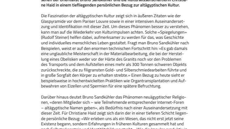 Die Faszination der altägyptischen Kultur zeigt sich in äußeren Zitaten wie der Glaspyramide vor dem Pariser Louvre sowie in einer intensiven Auseinandersetzung und Identifikation mit dieser Zeit. Um dieses Phänomen besser zu verstehen, kann man auf die Wiederkehr von Kulturimpulsen achten. Solche «Spiegelungen» (Rudolf Steiner) helfen dabei, aufmerksamer zu werden für das, was Geschichte und individuelles menschliches Leben gestaltet. Fragt man Bruno Sandkühler nach Beispielen, weist er auf den enormen technischen Fortschritt hin: «Es gab damals eine unglaubliche Meisterschaft in der Materialbearbeitung, die bei der Herstellung eines Obelisken weder vor der Härte des Granits noch vor den Problemen des Transports und dem Aufstellen eines mehr als 300 Tonnen schweren Objekts zurückschreckte, die zu filigransten Gold- und Silberschmiedearbeiten führte und in große Sorgfalt den Körper zu erhalten strebte.» Einen Bezug zu heute sieht er beispielsweise in hochentwickelten Praktiken wie Organtransplantation und Aufbewahren von Eizellen und Spermien für eine spätere Befruchtung.