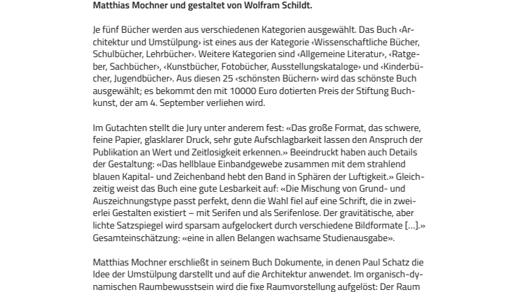Die Stiftung Buchkunst wählte aus 803 eingesandten Titeln die 25 schönsten deutschen Bücher des Jahres aus, darunter das Buch ‹Architektur und Umstülpung› von Paul Schatz aus dem Verlag am Goetheanum, herausgegeben von Matthias Mochner und gestaltet von Wolfram Schildt.