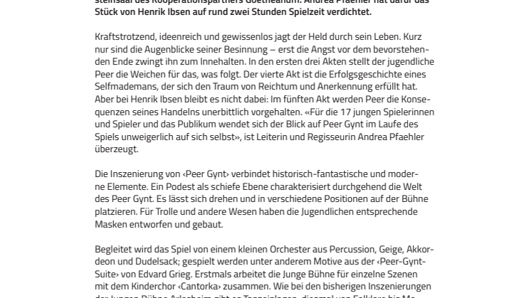 Kraftstrotzend, ideenreich und gewissenlos jagt der Held durch sein Leben. Kurz nur sind die Augenblicke seiner Besinnung – erst die Angst vor dem bevorstehenden Ende zwingt ihn zum Innehalten. In den ersten drei Akten stellt der jugendliche Peer die Weichen für das, was folgt. Der vierte Akt ist die Erfolgsgeschichte eines Selfmademans, der sich den Traum von Reichtum und Anerkennung erfüllt hat. Aber bei Henrik Ibsen bleibt es nicht dabei: Im fünften Akt werden Peer die Konsequenzen seines Handelns unerbittlich vorgehalten. «Für die 17 jungen Spielerinnen und Spieler und das Publikum wendet sich der Blick auf Peer Gynt im Laufe des Spiels unweigerlich auf sich selbst», ist Leiterin und Regisseurin Andrea Pfaehler überzeugt.