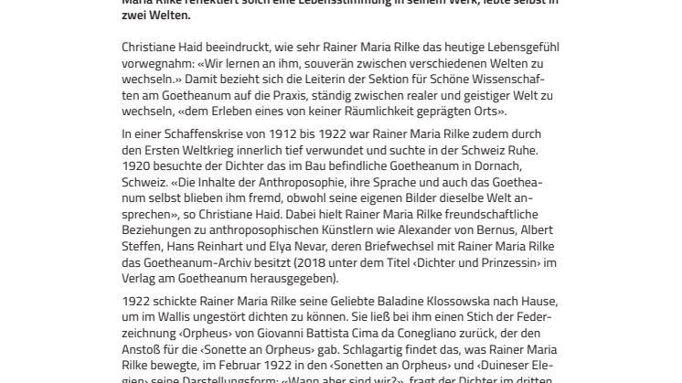 In einer Schaffenskrise von 1912 bis 1922 war Rainer Maria Rilke zudem durch den Ersten Weltkrieg innerlich tief verwundet und suchte in der Schweiz Ruhe. 1920 besuchte der Dichter das im Bau befindliche Goetheanum in Dornach, Schweiz. «Die Inhalte der Anthroposophie, ihre Sprache und auch das Goetheanum selbst blieben ihm fremd, obwohl seine eigenen Bilder dieselbe Welt ansprechen», so Christiane Haid. Dabei hielt Rainer Maria Rilke freundschaftliche Beziehungen zu anthroposophischen Künstlern wie Alexander von Bernus, Albert Steffen, Hans Reinhart und Elya Nevar, deren Briefwechsel mit Rainer Maria Rilke das Goetheanum-Archiv besitzt (2018 unter dem Titel ‹Dichter und Prinzessin› im Verlag am Goetheanum herausgegeben).