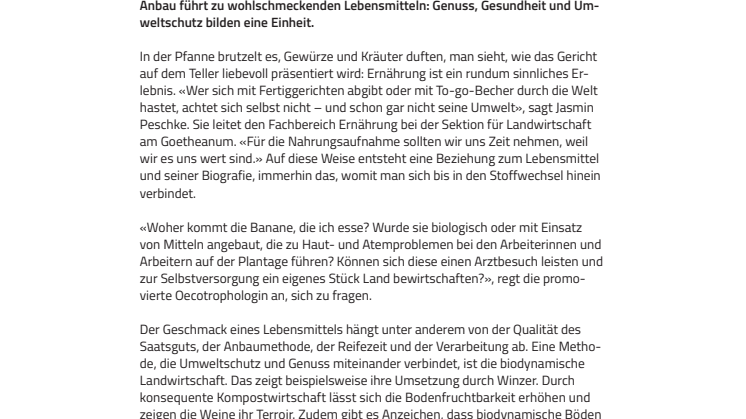 In der Pfanne brutzelt es, Gewürze und Kräuter duften, man sieht, wie das Gericht auf dem Teller liebevoll präsentiert wird: Ernährung ist ein rundum sinnliches Erlebnis. «Wer sich mit Fertiggerichten abgibt oder mit To-go-Becher durch die Welt hastet, achtet sich selbst nicht – und schon gar nicht seine Umwelt», sagt Jasmin Peschke. Sie leitet den Fachbereich Ernährung bei der Sektion für Landwirtschaft am Goetheanum. «Für die Nahrungsaufnahme sollten wir uns Zeit nehmen, weil wir es uns wert sind.» Auf diese Weise entsteht eine Beziehung zum Lebensmittel und seiner Biografie, immerhin das, womit man sich bis in den Stoffwechsel hinein verbindet.
