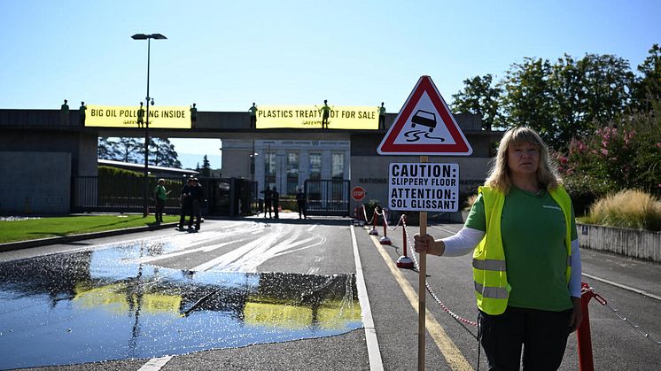 Genf, 7. 8. 2025 – Für ein starkes Abkommen gegen die Plastikflut protestieren heute morgen 22 Greenpeace-Aktivist:innen am Palais des Nations in Genf. Dort verhandeln Delegierte aus über 180 Staaten bei der UN-Plastikkonferenz. Die Umweltschützer:innen haben etwa 1000 Liter schwarze umweltverträgliche Farbe vor dem UN-Gebäude ausgeschüttet, die für das viele Öl steht, das die Produktion von Plastik erfordert. Außerdem entrollen sie auf dem Dach des Verhandlungsorts Banner mit der Aufschrift: “Big Oil Polluting Inside” (Enthält: Ölverschmutzung) und “Plastics Treaty Not For Sale” (Plastikabkommen nicht zu verkaufen). Ihr Protest richtet sich gegen den übermäßigen Einfluss der fossilen Industrie und der öl- und gasproduzierenden Staaten, die ein wirksames Abkommen verhindern wollen.