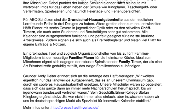 Gründer Andy Reiter erinnert sich an die Anfänge des Häfft-Verlages: „Wir wollten eigentlich nur das langweilige Aufgabenheft, das es an unserem Gymnasium gab, durch ein cooleres Hausaufgabenheft ersetzen. Unsere Mitschüler waren so begeistert, dass sich das ganze dann an immer mehr Nachbarschulen herumsprach, bis wir irgendwann bundesweit vertreten waren.“ Sein Geschäftsführer-Kollege Stefan Klingberg ergänzt stolz: „Es war nicht immer alles einfach, aber inzwischen haben wir uns im deutschsprachigen Markt als Spezialist für innovative Kalender etabliert.“