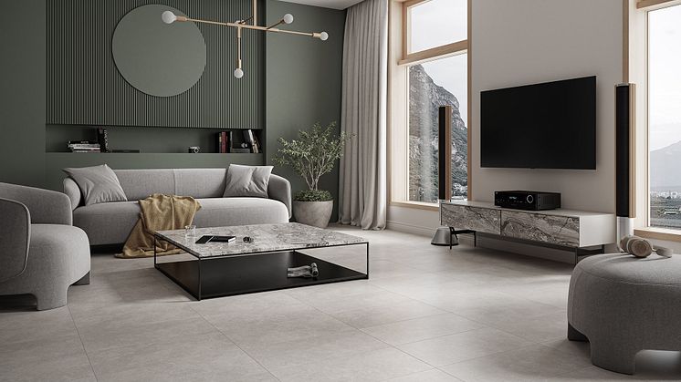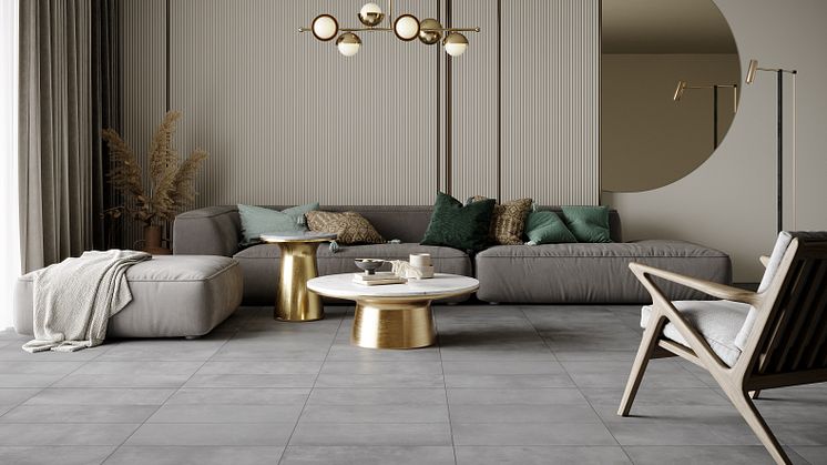 Die Serie CAMPA, hier in Grau, wurde um Bodenfliesen im Format 60 x 120 cm erweitert