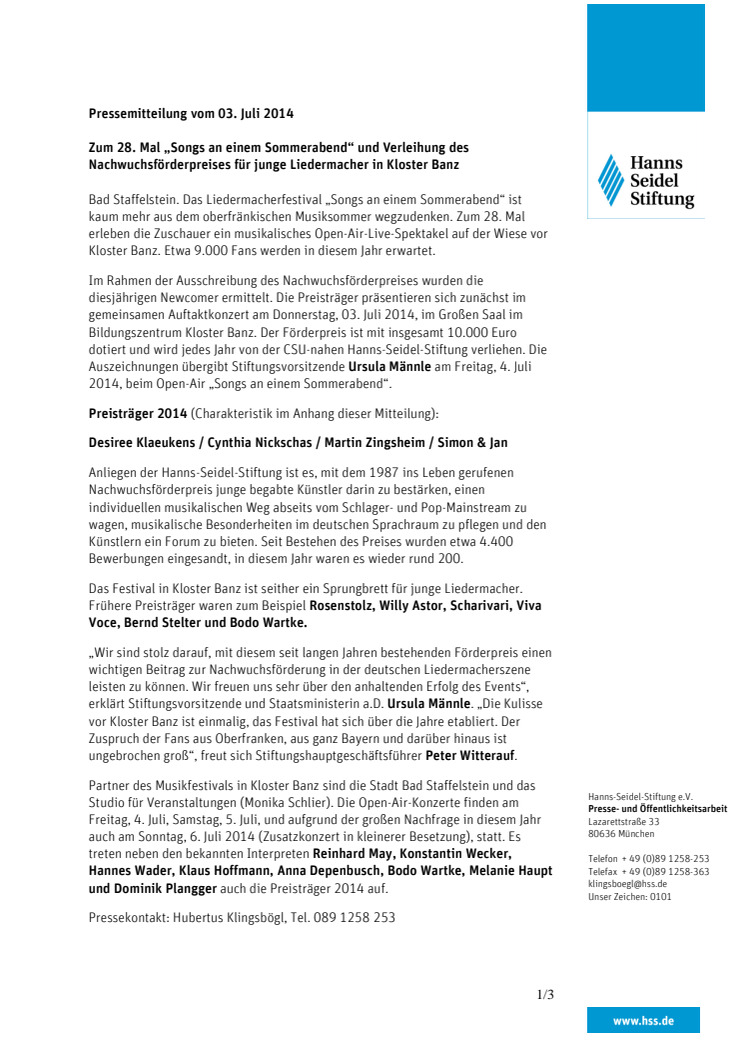 Zum 28. Mal „Songs an einem Sommerabend“ und Verleihung des Nachwuchsförderpreises für junge Liedermacher in Kloster Banz
