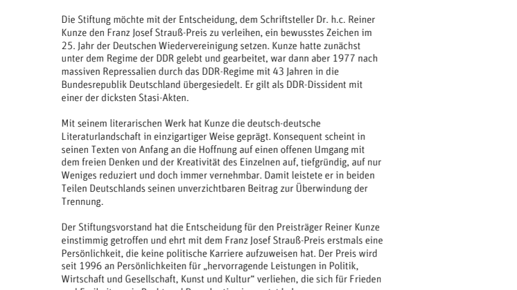 Der Stiftungsvorstand hat die Entscheidung für den Preisträger Reiner Kunze einstimmig getroffen und ehrt mit dem Franz Josef Strauß-Preis erstmals eine Persönlichkeit, die keine politische Karriere aufzuweisen hat. Der Preis wird seit 1996 an Persönlichkeiten für „hervorragende Leistungen in Politik, Wirtschaft und Gesellschaft, Kunst und Kultur“ verliehen, die sich für Frieden und Freiheit sowie Recht und Demokratie eingesetzt haben.