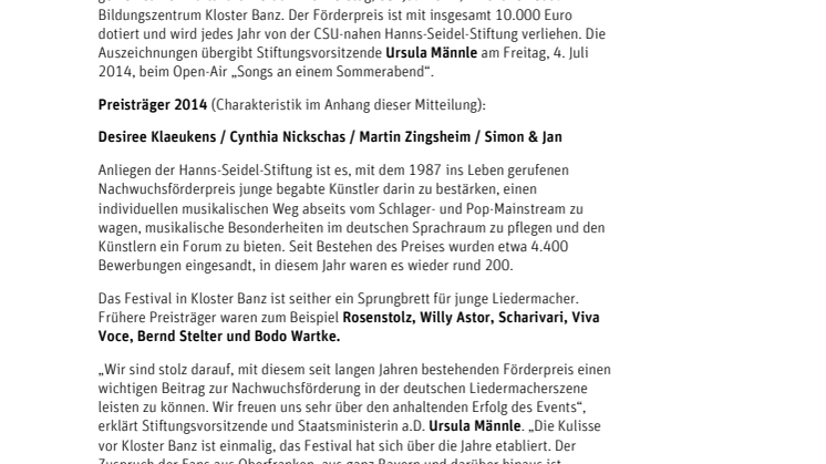 „Wir sind stolz darauf, mit diesem seit langen Jahren bestehenden Förderpreis einen wichtigen Beitrag zur Nachwuchsförderung in der deutschen Liedermacherszene leisten zu können. Wir freuen uns sehr über den anhaltenden Erfolg des Events“, erklärt Stiftungsvorsitzende und Staatsministerin a.D. Ursula Männle. „Die Kulisse vor Kloster Banz ist einmalig, das Festival hat sich über die Jahre etabliert. Der Zuspruch der Fans aus Oberfranken, aus ganz Bayern und darüber hinaus ist ungebrochen groß“, freut sich Stiftungshauptgeschäftsführer Peter Witterauf.