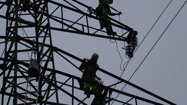 Als Vorbereitung für den Mastabbau demontieren Freileitungsmonteure die Seile: