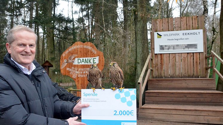 Torsten Klinger (1. Vorsitzender Förderungsverein Wildpark Eekholt e.V.), Kristin Höpner mit den beiden Turmfalken „Frida“ und „Freddy“ (Leiterin Falknerei Wildpark Eekholt) und Wolf-G. Frhr. v. Schenck (2. Vorsitzender Förderungsverein Wildpark Eekholt e.V., Geschäftsführer Wildpark Eekholt) erhalten den Scheck von Gerhard Petersen (Leiter des Netzcenters Segeberg), Martina Neas (Betriebsrätin aus Rendsburg SH Netz AG), und Kommunalbetreuer Daniel Schaefer von Schleswig-Holstein Netz.