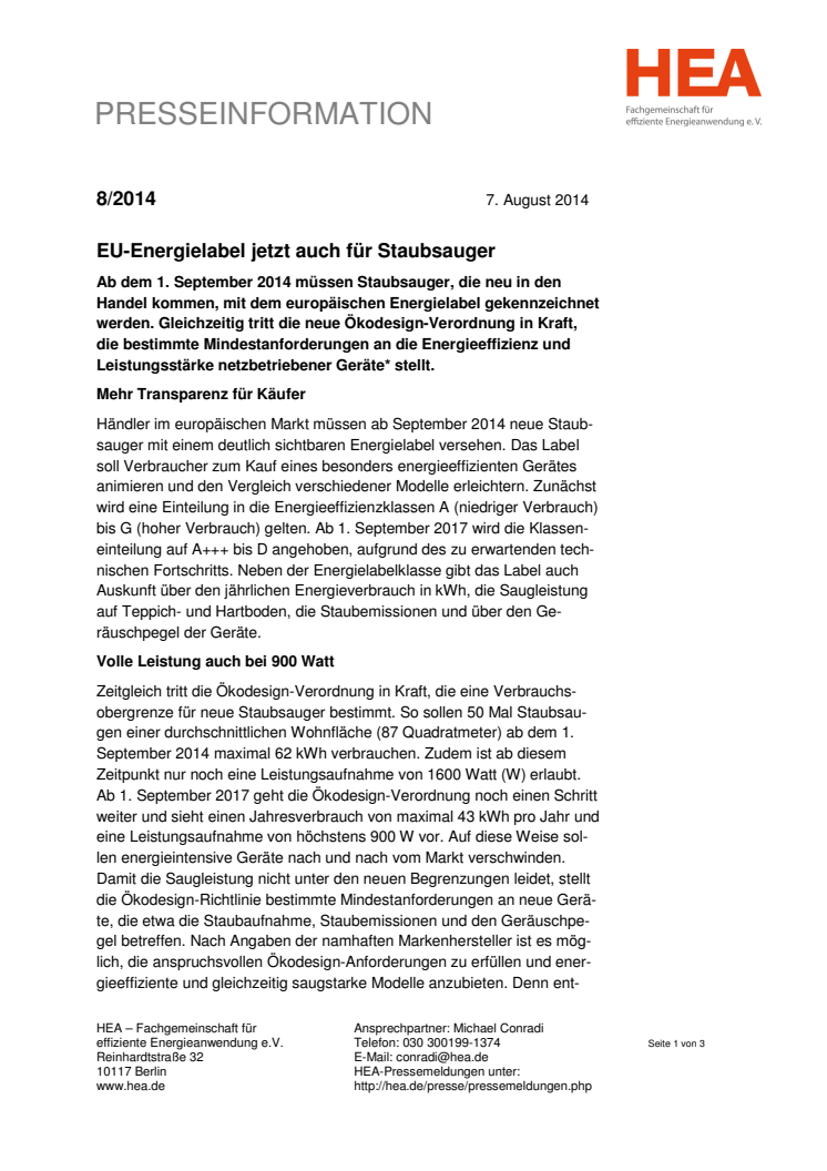 Ab dem 1.9.2014 müssen Staubsauger, die neu in den Handel kommen, mit dem europäischen Energielabel gekennzeichnet werden. Gleichzeitig tritt die neue Ökodesign-Verordnung in Kraft, die bestimmte Mindestanforderungen an die Energieeffizienz und Leistungsstärke netzbetriebener Geräte stellt. Informationen zum Energielabel für Staubsauger finden sich in einer kostenlosen HEA-Fachinformation.
