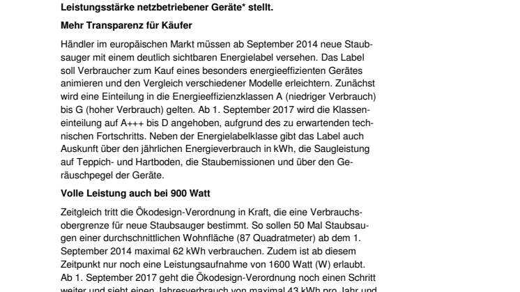 Zeitgleich tritt die Ökodesign-Verordnung in Kraft, die eine Verbrauchsobergrenze für neue Staubsauger bestimmt. So sollen 50 Mal Staubsaugen einer durchschnittlichen Wohnfläche (87 Quadratmeter) ab dem 1. September 2014 maximal 62 kWh verbrauchen. Zudem ist ab diesem Zeitpunkt nur noch eine Leistungsaufnahme von 1600 Watt (W) erlaubt. Ab 1. September 2017 geht die Ökodesign-Verordnung noch einen Schritt weiter und sieht einen Jahresverbrauch von maximal 43 kWh pro Jahr und eine Leistungsaufnahme von höchstens 900 W vor. Auf diese Weise sollen energieintensive Geräte nach und nach vom Markt verschwinden. Damit die Saugleistung nicht unter den neuen Begrenzungen leidet, stellt die Ökodesign-Richtlinie bestimmte Mindestanforderungen an neue Geräte, die etwa die Staubaufnahme, Staubemissionen und den Geräuschpegel betreffen. Nach Angaben der namhaften Markenhersteller ist es möglich, die anspruchsvollen Ökodesign-Anforderungen zu erfüllen und energieeffiziente und gleichzeitig saugstarke Modelle anzubieten. Denn entscheidend für die Saugleistung ist nicht die hohe Watt-Zahl sondern die Gerätekonstruktion, das Zusammenspiel von Saugdüsen, Ventilatoren, Motor und. Luftführung.