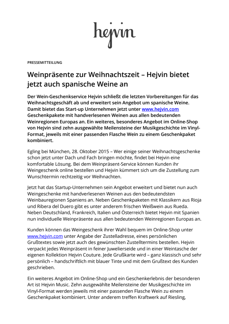 Der Wein-Geschenkservice Hejvin schließt die letzten Vorbereitungen für das Weihnachtsgeschäft ab und erweitert sein Angebot unter www.hejvin.com um spanische Weine. Ein weiteres Highlight im Online-Shop von Hejvin sind zehn ausgewählte Meilensteine der Musikgeschichte im Vinyl-Format, jeweils mit einer passenden Flasche Wein zu einem Geschenkpaket kombiniert.