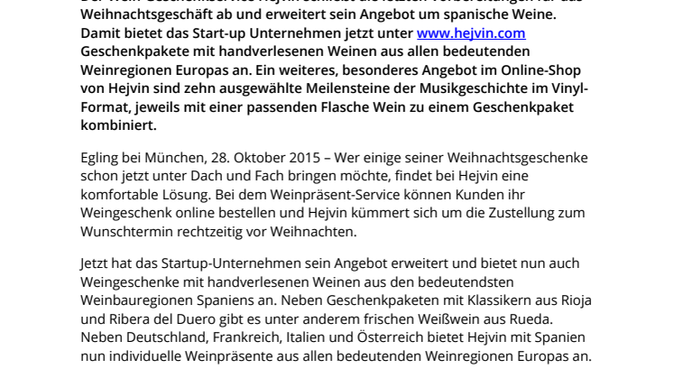 Egling bei München, 28. Oktober 2015 – Wer einige seiner Weihnachtsgeschenke schon jetzt unter Dach und Fach bringen möchte, findet bei Hejvin eine komfortable Lösung. Bei dem Weinpräsent-Service können Kunden ihr Weingeschenk online bestellen und Hejvin kümmert sich um die Zustellung zum Wunschtermin rechtzeitig vor Weihnachten.