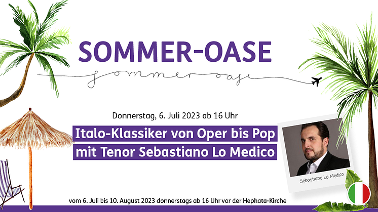 Die Sommer-Oase startet am 6. Juli ab 16 Uhr mit Sebastiano Lo Medico im Urlaubsland Italien. „Musik für die Seele“ präsentiert der in Sizilien geborene Tenor. Sein Repertoire reicht von Klassik bis Italo-Pop und von Andrea Bocelli bis Zucchero. Sebastiano Lo Medico sang bereits den Don Juan und tourte unter anderem durch China, Japan und Portugal.