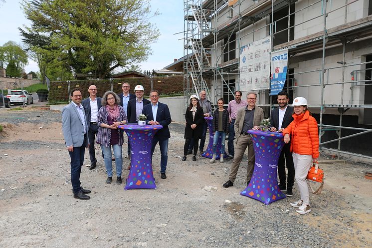 Christian Henkel, Bürgermeister der Gemeinde Fliedem, Dr. Michael Gerhard, kaufmännischer Vorstand Hephata, Sandra Lüttecke, Sozialraumteam Hephata, Kai Wettlaufer, Geschäftsbereichsleiter Soziale Teilhabe, Jörg Möser, RJ-Planungsbüro, Rainer Möller, Regionalleiter Soziale Teilhabe, Diana Pfeifer, RJ-Planungsbüro, Uwe Grosser, Daniela Kutscher und Simon Wingenfeld, Bauunternehmen Wingenfeld, Maik Dietrich-Gibhardt, Vorstandssprecher Hephata, Mahsum Sen und Renée Möser, RJ-Planungsbüro.