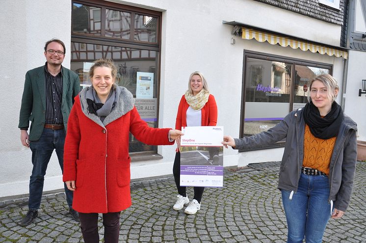 Hilft beim ersten Schritt raus aus der Abhängigkeit: Das Team von Step One am Marktplatz von Treysa mit (von links) Rasmus Terörde, Anna Roth, Maya-Leonie Lipphardt und Jennifer Greve.