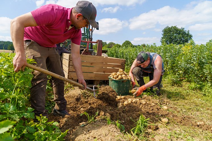 Um die empfindliche Schale der Frühkartoffeln nicht zu verletzen, werden sie besonders schonend geerntet.