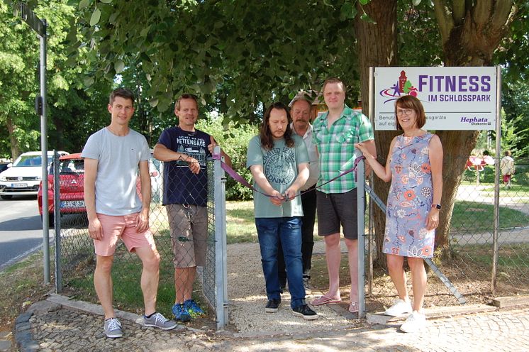 Freuen sich über den neuen Outdoor-Fitness-Parcours: Otto Patrick (Einrichtungsleitung Bereich Pflege), Hardy Schneider (Haustechnik) sowie Dominik Gerber, Klaus Petri, Carsten Tusche und Ursula Nölker (Regionalleitung, von links)