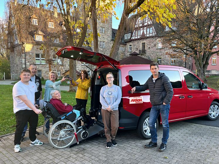 Bewohner*innen und Mitarbeiter*innen freuen sich über den neuen Dienstwagen: Leon Eisenberg (dualer Student Soziale Arbeit), Johann Jahn (Bewohner Wohnpflege), Samira Wolfram (FSJ) und Patrick Otto (Einrichtungsleitung, vordere Reihe, von links) sowie Sven Saul (Bewohner Wohnpflegeheim), Elke Döll (Ergotherapeutin und soziale Betreuung) und Regionalleiterin Ursula Nölker (hintere Reihe, von links).