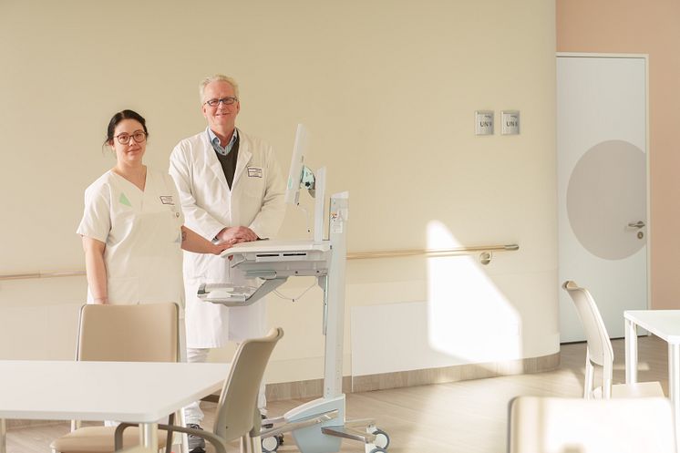 Stationsleiterin Gesundheits- und Krankenpflegerin Sabrina Schiller und Oberarzt Franz Lutz stecken in den letzten Vorbereitungen für die Eröffnung der neuen Station der Hephata-Klinik.