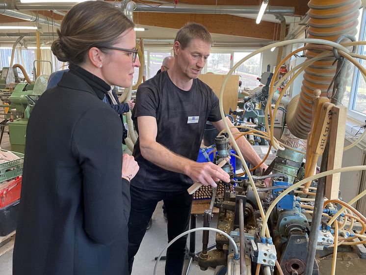Drechslermeister Uwe Krummer führte die Besucher*innen beim Tag der offenen Tür in der Schreinerei zum Herzberg in die alte Handwerkskunst ein - hier im Bild mit Nina Klein, die für die Wintershall Dea Stiftung eine Großspende dabei hatte.