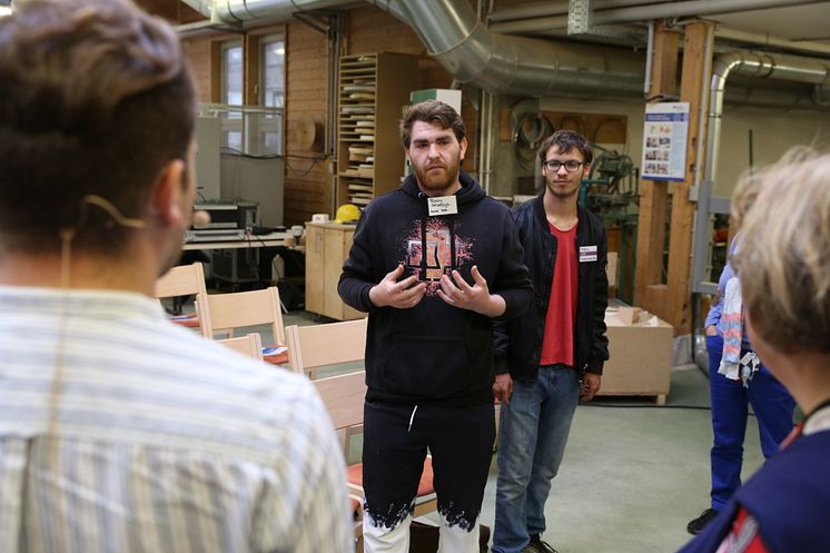 Ronny Strzelczyk, Auszubildender in der Hephata-Berufshilfe, führte die Gäste durch die Holzwerkstatt.