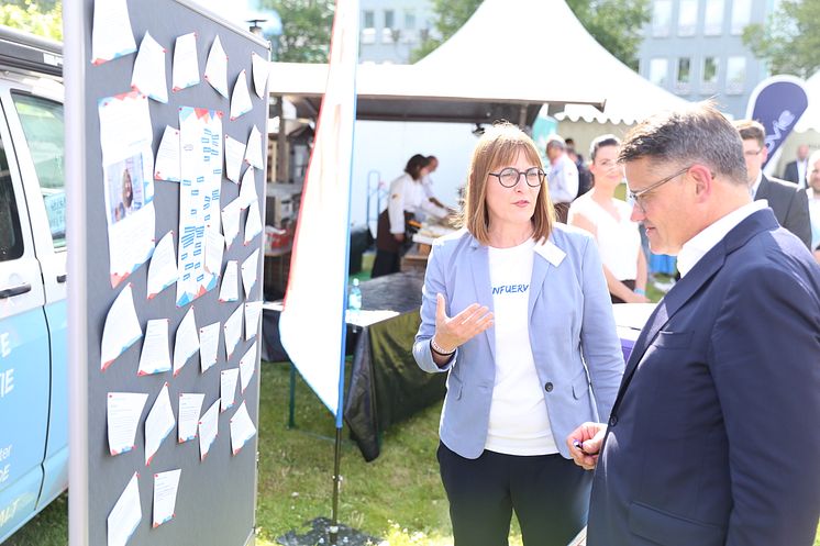Dagmar Krauße, Sprecherin von „Offen für Vielfalt“, erklärt Ministerpräsident Boris Rhein die Love-Letter-Aktion. An einer Pinnwand konnten Gäste des Hessenfest wählen, an welche für Demokratie und Vielfalt engagierte Person sie einen Brief mit Herz, Handschrift und Foto senden wollten.