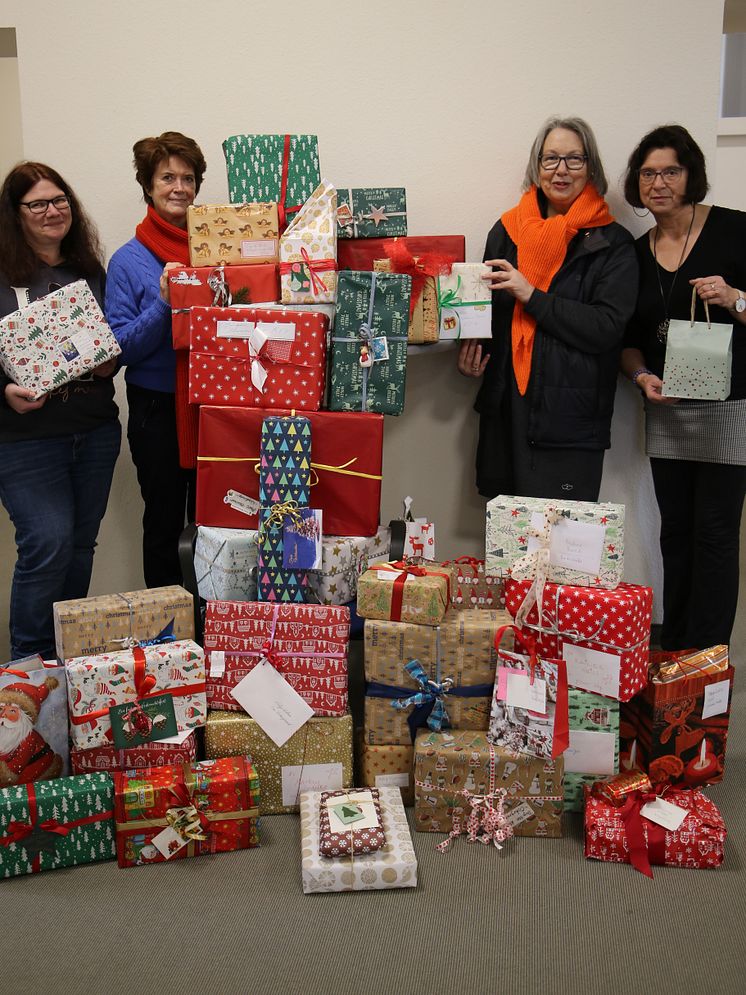 Die Genschenke türmen sich: Birgit Massin-Erbe und Claudia Borowski (Mitte) vom Zonta Club Hanau übergeben die bunten Päckchen. Ursula Henkel (rechts) und Jennifer Sorg (links) nahmen sie dankend entgegen und organisieren die Verteilung an die Hephata-Bewohner*innen.
