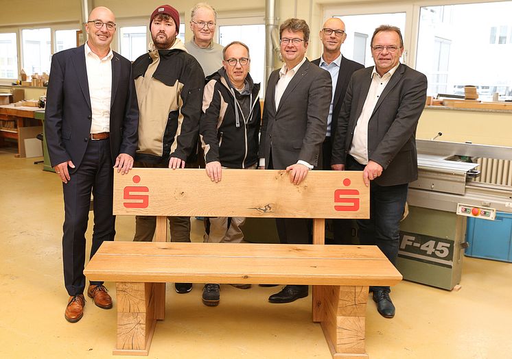 Bank-Experten (von links): Sparkassen-Vorstand Michael von Bredow, Jonas Bleistein, Walter Ulrich und Dirk Mandt von der Für-Uns-Manufaktur, Sparkassen-Vorstand Thomas Roß, Hephata-Vorstand Dr. Michael Gerhard und Landrat Wilfried Becker.