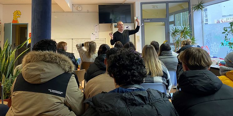 Der ehrenamtliche "Geldlehrer" Jörg Ulhlenbrock in der Unterrichtseinheit an der Dietrich-Bonhoeffer-Schule am Standort Kassel.