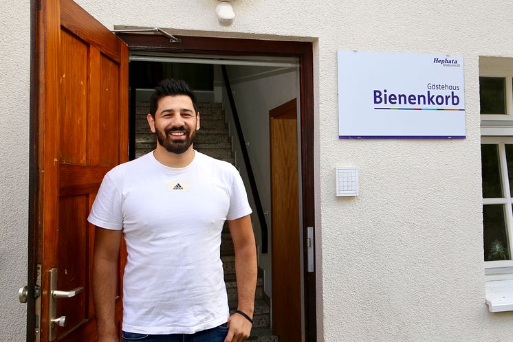 Michael Kashour, Teamleitung in der Wohngruppe Bienenkorb, steht vor der Jugendhilfe-Einrichtung auf dem Hephata-Stammgelände.