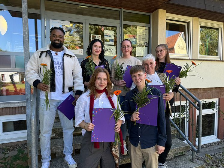 Die Absolvent*innen (hinten, von links): Senfra Nigusse Mulat, Tanja Morafka, Ann-Christin Schiffl und Joulina Sophie Döring. Vorne: Carlotta Tautermann, Jasmin Chudy und Simone Löffler.