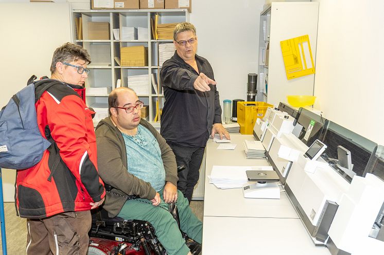 (v.l.): Sabrina Dudek und Daniel Schäfer schnupperten in die LWV-Poststelle rein, wo ihnen LWV-Mitarbeiter Michael Geister die Arbeitsabläufe erklärte.